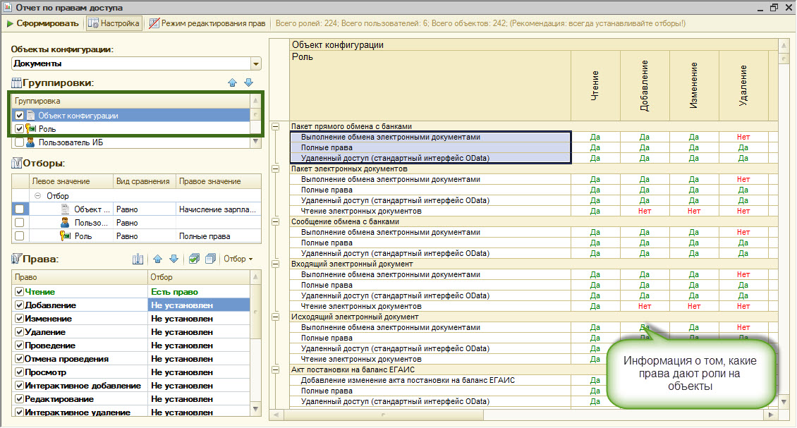 1. Какой пользователь какие права имеет на объекты конфигурации.
