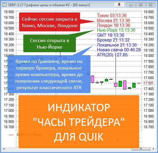 Индикатор предназначен для отображения на графике времени в разных часовых поясах бирж Токио, Лондона, Москвы, Нью-Йорка. А также, выделяет подсветкой города, где сейчас проходят торги на фондовой бирже.